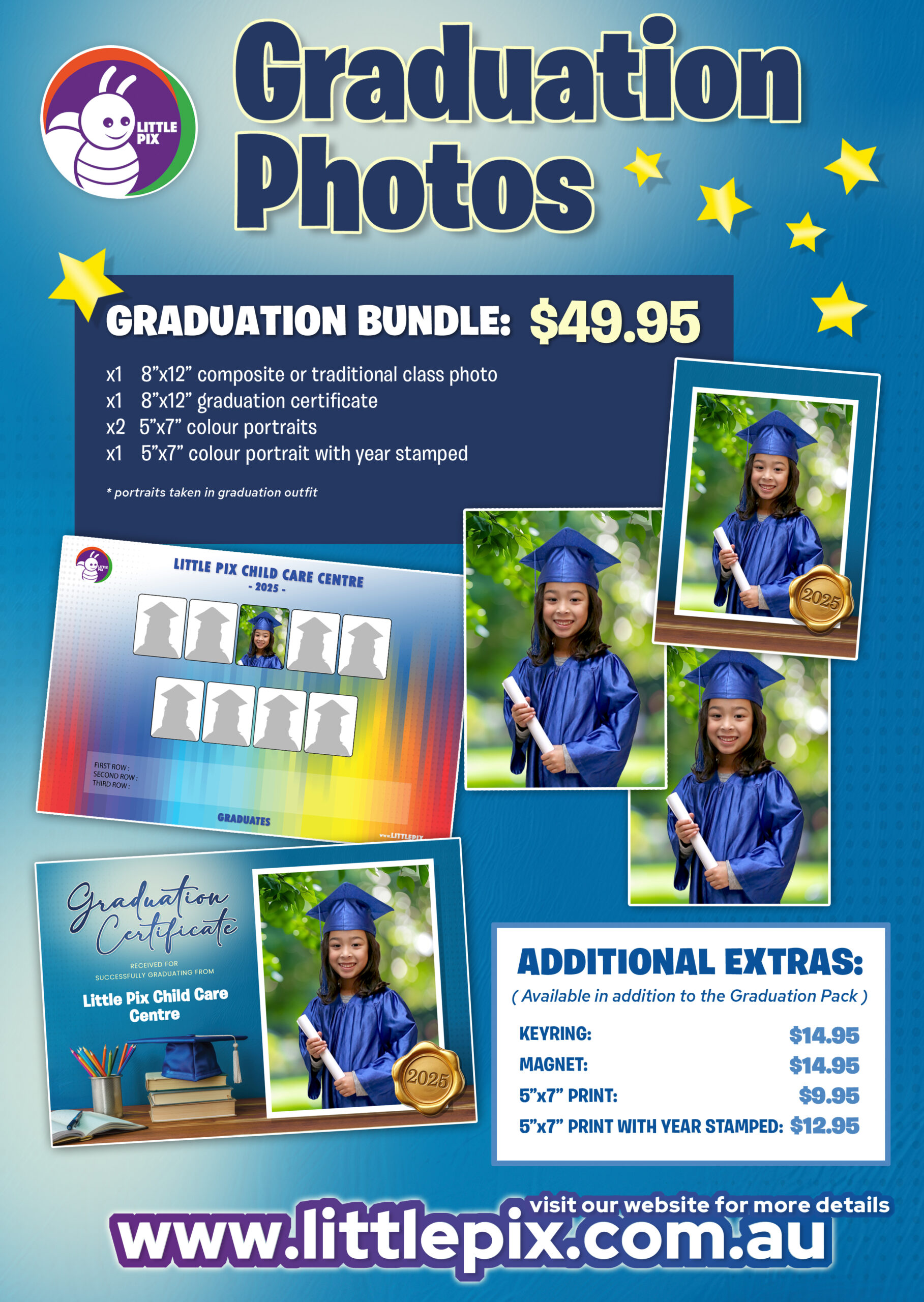 Please keep in mind that having a parent or carer present during photos can sometimes lead to a more overwhelming experience for the child. We ask that you allow the Little Pix Team to work their magic and photograph your child and their classmates with parents or carers waiting in a different space.